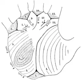 Fig. 3. Diagram of a Left Palm, showing the designations to be used in making the descriptive formulæ. Compare with Fig. 7. When a pattern is not present in this region, 3 may signify approximately the lower third of the entire outer margin, and 5 the remainder.