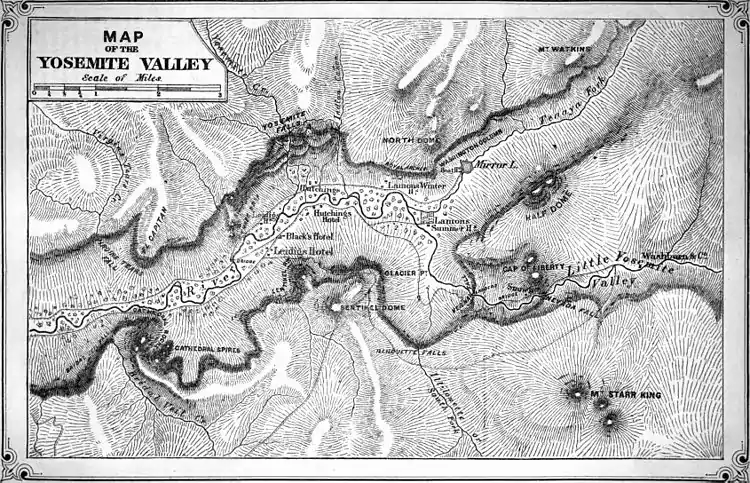 It is nearly in the centre of the state N. and S., and just midway between the E. and W. bases of the Sierra Nevada, here a little more than 70 m. wide. It is nearly level, about 6 m. long by ½ m. to 1 m. wide, and nearly a mile in perpendicular depth below the general level of the adjacent region. Its general direction is N. E. by E. and S. W. by W., nearly at right angles with the general trend of the mountains; its elevation above the sea is 3,950 ft. Its granite walls are nearly vertical; their color is a light gray, reflecting brilliantly white in the sunlight, occasionally varied with veins of a brighter or deeper hue. In places stripes of a darker color, gray, brown, and black, are produced by the flowing down of water carrying organic matter. Various species of trees and plants occur in the valley. In winter it is inaccessible, except on snow shoes; in summer the nights are cool, but the thermometer almost always rises above 80° in the middle of the day in June and July. There are several hotels for the accommodation of tourists. The valley is reached by stage or stage and horseback (about 90 m.) from Merced, Milton, and Oakdale, on branches of the Central Pacific railroad. The principal objects of interest will be described proceeding up the valley. The first on the right is the Bridal Veil fall, formed by a creek of the same name, which is precipitated over the cliffs in one leap of 630 ft. perpendicular upon a slope, down which it rushes in a series of cascades for a perpendicular distance of nearly 300 ft. The effect from the valley is as of a vertical fall of 900 ft., the base being concealed by trees. The column of water sways to and fro in the wind, seeming in the distance to flutter like a white veil. A little higher up is Cathedral rock, a prominent and massively sculptured pile of granite, the summit of which is 2,660 ft. above the valley. Above this are the “Spires,” isolated columns of granite at least 500 ft. high, standing out from, but connected at the base with, the walls of the valley. Still further up a point of rocks projects into the valley, terminating in a slender mass of granite somewhat resembling an obelisk. This is known as Sentinel rock. Its entire height is 3,043 ft.; the obelisk form continues down for 1,000 ft. or more from the summit, below which the rock is united with the wall of the valley. A short distance above is Glacier point, from which one of the finest views in the valley may be obtained. Back of Sentinel rock is Sentinel dome, 4,150 ft. above the valley, which commands a fine view of the Yosemite fall. On the left side of the valley, opposite the Bridal Veil fall, is the Virgin's Tears fall, where the creek of that name leaps over the wall more than 1,000 ft. Just above is El Capitan, an immense block of granite projecting into the valley and presenting an almost vertical edge 3,300 ft. high. Further up, and nearly opposite Sentinel rock, are the Three Brothers, a group of rocks rising one behind another, the highest being 3,830 ft., and from its summit affording a splendid view of the valley and surroundings.