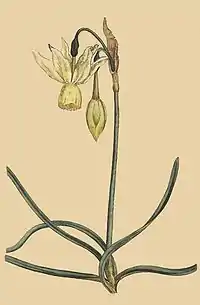 NARCISSUS triandrus spatha sub-uniflora, nectario campanulato crenato dimidio petalis breviore, staminibus ternis. Lin. Syst. Vegetab. p. 317.