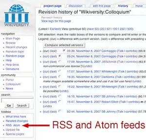 You can also obtain RSS or Atom feeds for changes to any Wikiversity page. Go to the article's history page and use the toolbox link labeled "rss" to subscribe to this feed. See this Wikipedia article for more information.