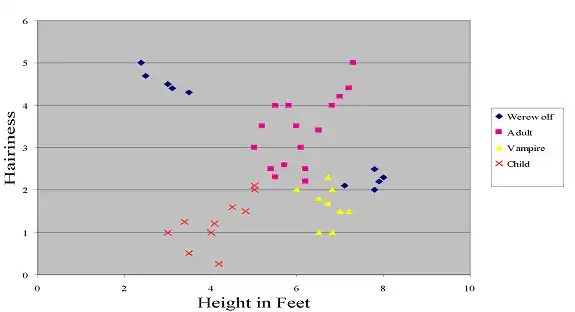 To train your robot you need to select a set of features which the robot can detect and which also can be used to tell the difference between humans, vampires and werewolves. Further, after having your nephew Scotty ruin one of your priceless antique hair dryers, which you keep in the billiard room you decide that the robot should also detect children entering the room. After reading up on the nature of the undead and after taking careful measurement, you realize that the two best features for detection are how tall a person is who is entering the room is and how hairy they are. This works because vampires are tall and completely bald, werewolves are either short and totally covered in fur, or they are the mutant type that are extremely tall, but no more hairy than a human. An adult human is taller than a child and slightly hairier. The chart below shows samples that you took to validate your hypothesis.