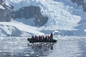 By sea is how most visitors arrive. The southern oceans are never calm, and often very rough even in summer, with hurricane-force winds and 20 m / 70 ft waves. The ship is designed to handle this so your main risks are three days of upchucking, being thrown about, falling down a stair well, or having heavy doors or items crash into you. Always have one secure handhold, and in severe weather stay in your cabin. Trips won't venture ashore in poor weather but it may deteriorate: be extremely cautious when returning in a zodiac and follow crew instructions on when to hold still and when to cross onto the landing stage. If you fall in, your survival time in these waters is less than a minute.