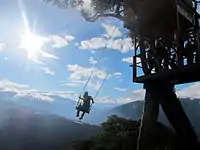 - 🌍 Parque Aventura San Martin, ☏ +593 98 498 6245. Well-run set of cables with competent guides and good name-brand gear. The zipline trip goes once into a crevasse between two rocks at a mild incline, followed by a climb, a rope bridge, and a zipline back to nearly the start point. It's about 10 minutes out of town, and takes 15-20 min to complete the circuit. $20+$5 for some photos and a video.