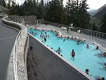 - 🌍 Banff Upper Hot Springs and Pleiades Massage & Spa, Upper end of Mountain Avenue, ☏ +1 403-762-1515, toll-free: +1-800-767-1611, hot.springs@pc.gc.ca. 10AM-10PM varies seasonally. All the amenities of a modern facility are featured in this historic spa and bathhouse, with a backdrop of spectacular alpine scenery. Relax in soothing hot water where travellers have come to "take the waters" for more than a century. For an extra apres ski laugh, guests wishing to amuse can rent a hilarious 'traditional style' bathing costume. The outdoor hot pool is a great place to soak and watch falling snowflakes or the stars. Can be quite busy at times. In late spring, the hot springs flow sometimes drops significantly and must be supplemented with artificially-heated water. The Upper Hot Springs website's "Water" page states whether they are using all hot springs water or are supplementing. $7.30 per adult.