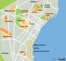 The Byrsa Hill at the rear of the area dominates both the ocean gulf and the lake and plain of Tunis inland to the west, and is therefore the most strategic point.