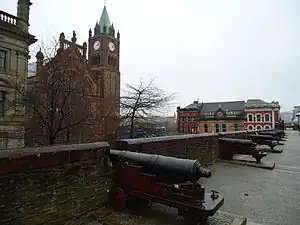 - Guildhall, Guildhall St BT48 7BB (opposite Tower Museum), β +44 28 7137 6510. Daily 11:00β16:00. Built in 1890, this fine building is where the city council meet. It's just outside the city walls, and for decades its councillors saw their role as shutting the Catholics out of housing and jobs as effectively as the walls shut out King James. It therefore became a target for nationalists and was twice bombed. It contains a museum exhibit on the history of Derry, a small exhibit on the Saville Inquiry and houses the Nobel, Gandhi and Martin Luther King Jr peace prizes of John Hume. In summer there are guided tours but these are suspended in 2021, but an outdoor 15 minute tour is available on request for Β£2 as of February 2023. Free.