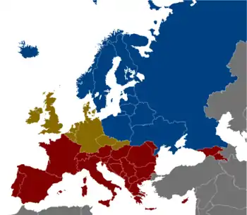 Over time more countries joined the European Community, while more powers were given to the community level, and EC was renamed the European Union in 1992. An EU currency, the euro, was introduced, with some members adopting it in place of their own currencies. As of 2023, the EU has 27 members and 8 countries are in different stages of "accession talks" for joining. A few countries like Iceland, Norway and Switzerland have decided to stay outside (with strong integration). Greenland and the United Kingdom have left the union.