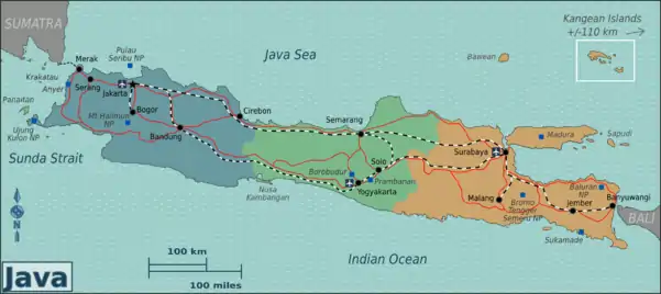 Java (Indonesian: Jawa) is an island in Indonesia. The much smaller but still sizable island of Madura, off the coast of and covered as part of the region of East Java, is also included in this article.