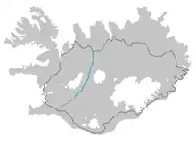 North of Hveravellir, the landscape gradually changes to heathland and tundra. You pass the "longest fence in Iceland", erected to prevent the spread of sheep diseases. Once you have crossed the Dúfnefsfell, you come to the Árnarbæli hut, from there you have a beautiful view of Langjökull, Hofsjökull and to Kerlingarfjöll. You'll leave the high valley of Kjölur, as it slowly becomes greener and numerous sheep can be seen on the humpback meadows. You'll then pass the small Cafe Áfangi, where horse riding trips are occasionally offered. At the southern end of the Blöndulón lake district is Áfangafell with a small parking lot and a beautiful view. Due to the reservoir, the slope was rerouted here and the streams and rivers were bridged. The Blöndulón, which has been dammed since the late 1980s, is now the fourth largest lake in the country at over 56 km2 (22 sq mi). The Blandá power plant generates 150 MW of power at a waterfall height of 288 m. The Kjölur slope ends around the power station.