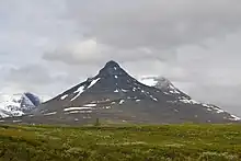 The trail enters Sweden at the tripoint and soon, after the nearly 1000 m Tuipali hill, descends into the lush Pältsa valley. The Pältsa hut (14 km) is manned in season, with sauna. It was used as a base for Norwegian resistance during WW2. The Pältsan fell (Bealčán) has 1404 and 1444 m peaks, the former a Nunatak during the last ice age, protruding through the ice.