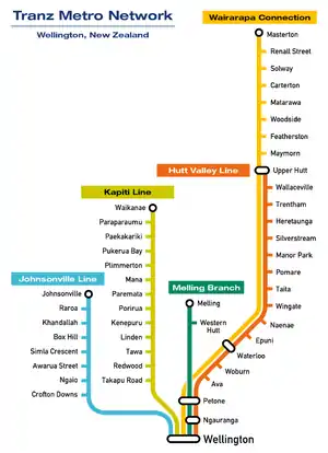 There is also the Wairarapa Connection between Masterton and Wellington, which operates five services in each direction on weekdays and two services in each direction on weekends. Operated by Wellington commuter operator Metlink, this train blurs the line between long distance and commuter rail - it operates a commuter-orientated timetable and doesn't have the snack servery, open air carriages, checked luggage or reserved seats of long distance services; but it has the luggage room, long-distance seats, tray tables, power outlets and toilets which commuter services in New Zealand don't have.