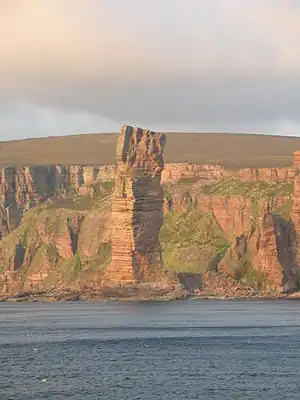 - π Hoy to the south-west is the second largest island. "Hoy" means high, and it feels more Hebridean than Orcadian: upland heath with poor soil, clouds and drizzle. Its main sight is the sea-stack "Old Man of Hoy", with a hike through the RSPB Nature Reserve to view it. The main village is Lyness.