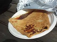 - Tapioca (or more precisely, "beiju de tapioca"): made with the cassava starch, also known as tapioca starch. When heated in a pan, it coagulates and becomes a type of pancake or dry crepe, shaped like a disk. Some will serve it folded in half, others will roll it rocambole-style. The filling varies, but it can be done sweet or savory, with the most traditional flavors being grated coconut/condensed milk (sweet), beef jerky/coalho cheese, plain cheese, and butter (savory). It has become a "gourmet" food item, to be treated with creativity; nutella, chocolate, napolitano (pizza cheese/ham/tomato/oregano) and shredded chicken breast/catupiry cheese being almost standard options nowadays.