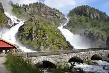 - 🌍 Låtefossen waterfall (Road 13 south from Odda). 24 h. The most popular of the waterfalls in the "valley of waterfalls". A 160 meters high cascade fall. Road 13 crosses the flow on a fine bridge and mist from the cascade keeps the road wet. Free.