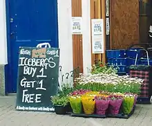 A "buy one get one free" sign at a flower stand (obtainable without additional payment).