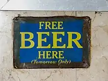 A sign advertising free beer (obtainable without payment). It is a joke: every day the sign is read, the free beer will be available "tomorrow" (ergo never).