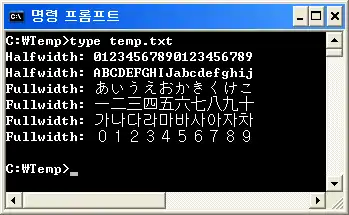 A Korean command prompt showing halfwidth and fullwidth characters.