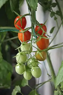 - A type of small tomato similar in shape to a plum tomato but small like a cherry tomato.